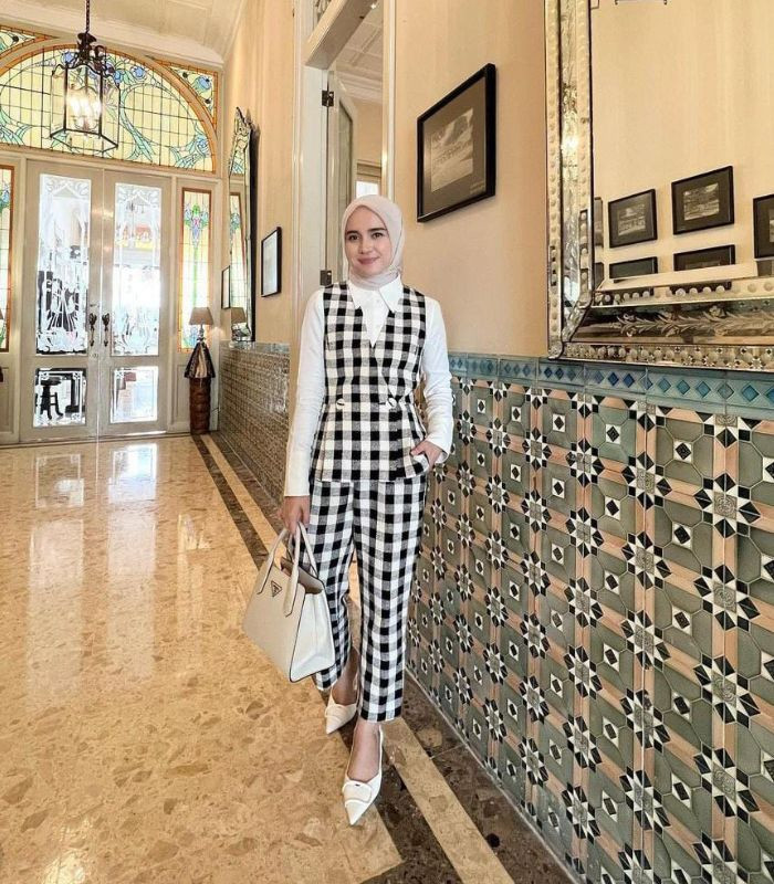 9. Tampil dengan gaya monochrome style yang terkesan preppy chic. Analisa menggabungkan sleeve shirt putih dibalut dengan stelan blouse dan straight pants motif kotak-kotak kombinasi warna hitam dan putih tak lupa ia memilih hijab segi empat berwarna soft pink. Tambahkan hand bag dan heels berwarna broken white senada.