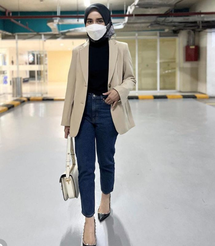 10. Terakhir, gunakan inner long sleeve dan hijab segi empat berwarna hitam senada dibalut dengan blazer warna cream padukan dengan celana panjang jeans, lengkapi outfit dengan hand bag dan heels andalanmu, ya.