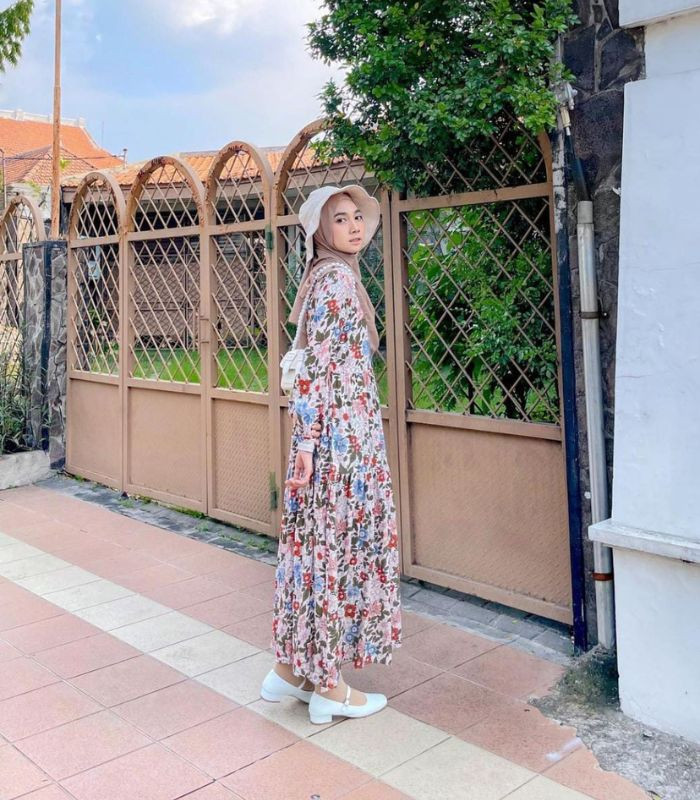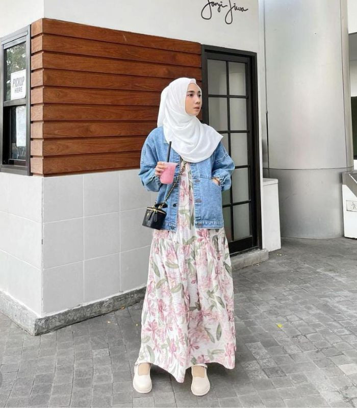 10. Pairing denim jacket plus floral dress memang tidak pernah gagal, tak lupa dipadukan dengan hijab pashmina berwarna putih yang senada dengan sling back shoes, tampil eye-catchy yang kekinian.