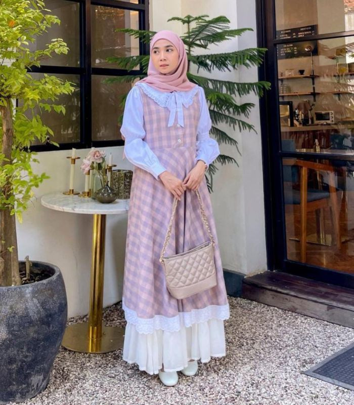 11. Mengusung konsep vintage style yang aesthetic. Pilih dress warna soft purple motif kotak-kotak dengan aksen kain tulle dibagian bawahnya dan wide collar yang tampak cantik.