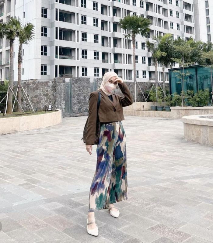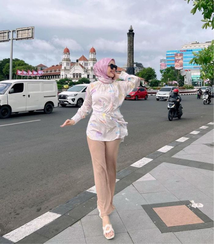 4. Tampil softgirl yang terkesan cantik. Gunakan blouse putih dengan aksen floral dikombinasikan dengan hijab pashmina pattern berwarna pink serta high waist loose pants berwarna dusty pink. Lengkapi penampilanmu dengan sunglasses dan slip on sandals.