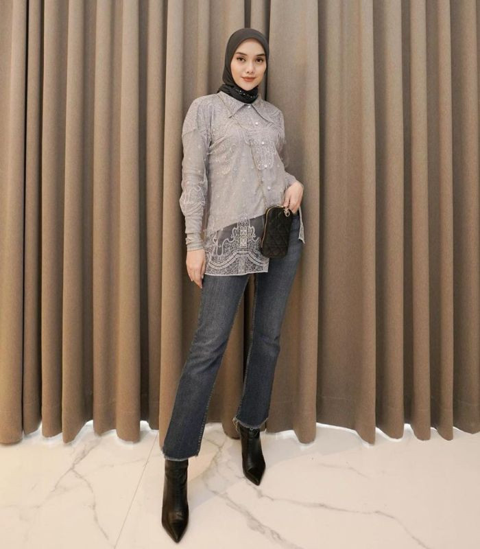 3. Gaya satu ini terkesan boyish chic namun tetap terlihat feminin yang apik. Pilih sleeve shirt dengan aksen brokat dipadukan dengan straight jeans serta hijab segi empat berwarna charcoal, berikan statement point pada outfit-mu dengan ankle boots hitam yang senada dengan sling bag.