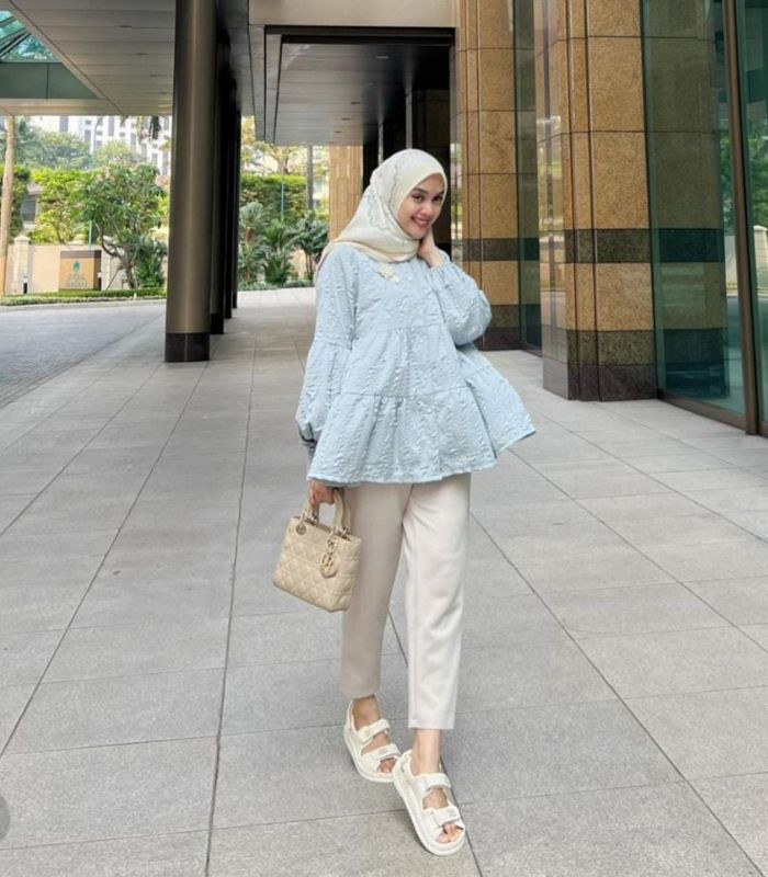 5. Penampilan dengan mengusung konsep warm look yang manis. Gunakan ruffle blouse berwarna soft blue dipadukan dengan hijab segi empat printing berwarna soft yellow serta straight pants berwarna ivory, tambahkan hand bag dan slip on sandals favoritmu.