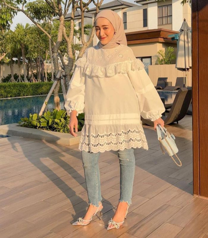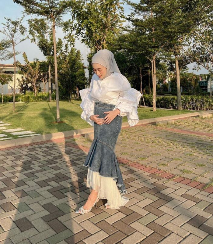 2. Seviqe menggabungkan blouse putih model ruflle beraksen balon pada bagian tangan dengan rok span jeans kombinasi kain tulle dibagian bawahnya tak lupa gunakan hijab pashmina berwarna light grey, outfit yang cocok dikenakan untuk acara semi formal.