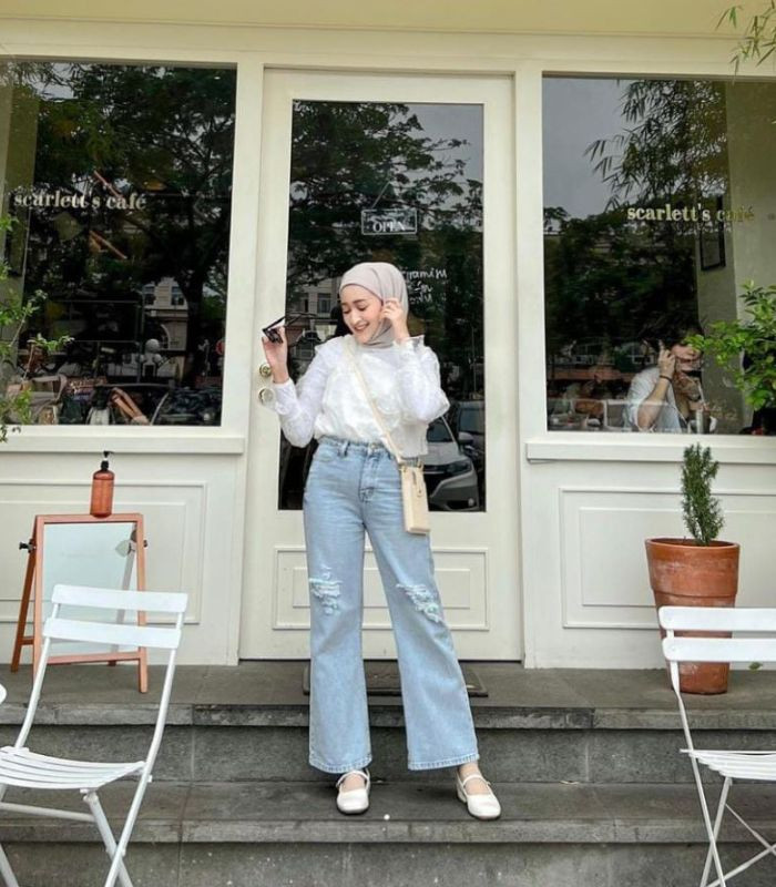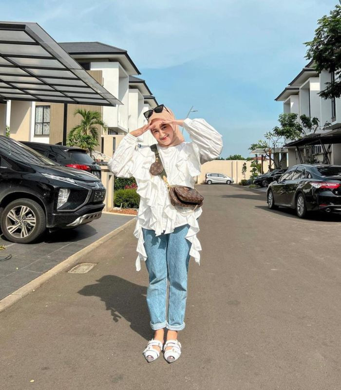 7. Tampil menggemaskan dengan menggunakan blouse putih model ruffle ini dipadukan dengan celana boyfriend jeans dan hijab segi empat berwarna beige. Lengkapi outfit dengan sling bag dan slip on sandals favoritmu.