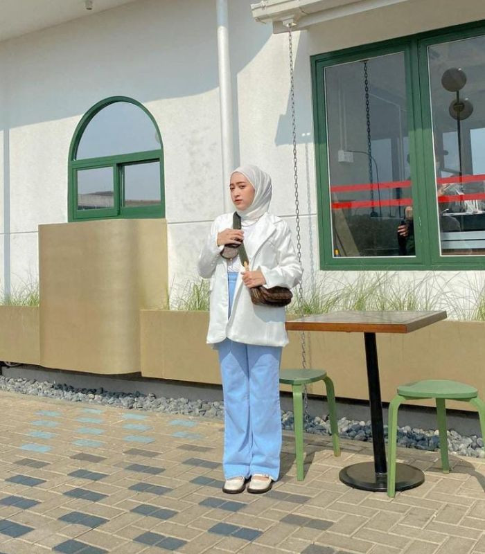 8. Terkesan elegan look yang cocok juga dikenakan buat office look. Seviqe memilih inner, blazer, dan hijab pashmina berwarna serba putih dipadukan dengan celana kulot jeans.