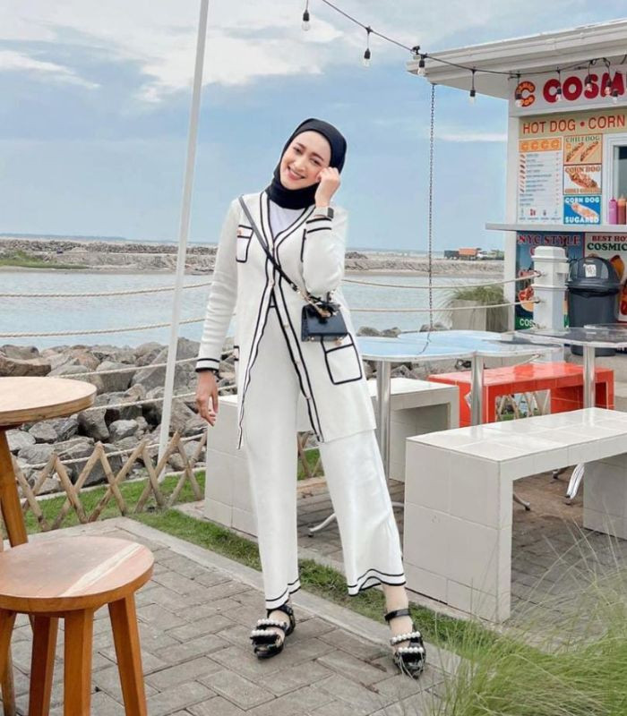 9. Style modis dari white on white, gunakan inner dibalut stelan long cardigan dengan aksen hitam di kantong dan tepi-nya dengan celana kulot kemudian hijab pashmina, sling bag, dan mules shoes warna hitam senada.
