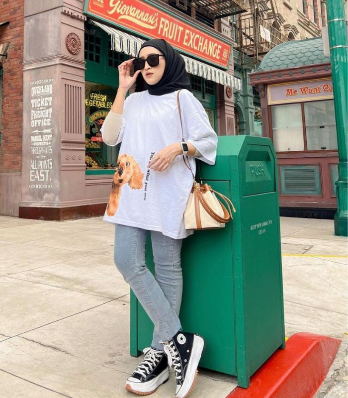 10. Terakhir, cocok buat Anda yang ingin gaya santai dan anti ribet namun tetap terlihat modis. Gunakan inner dibalut oversized t-shirt putih padukan dengan straight jeans dan hijab pashmina hitam yang senada dengan sunglasses dan warrior shoes, tambahkan sling bag bikin look-mu terlihat kece abis.