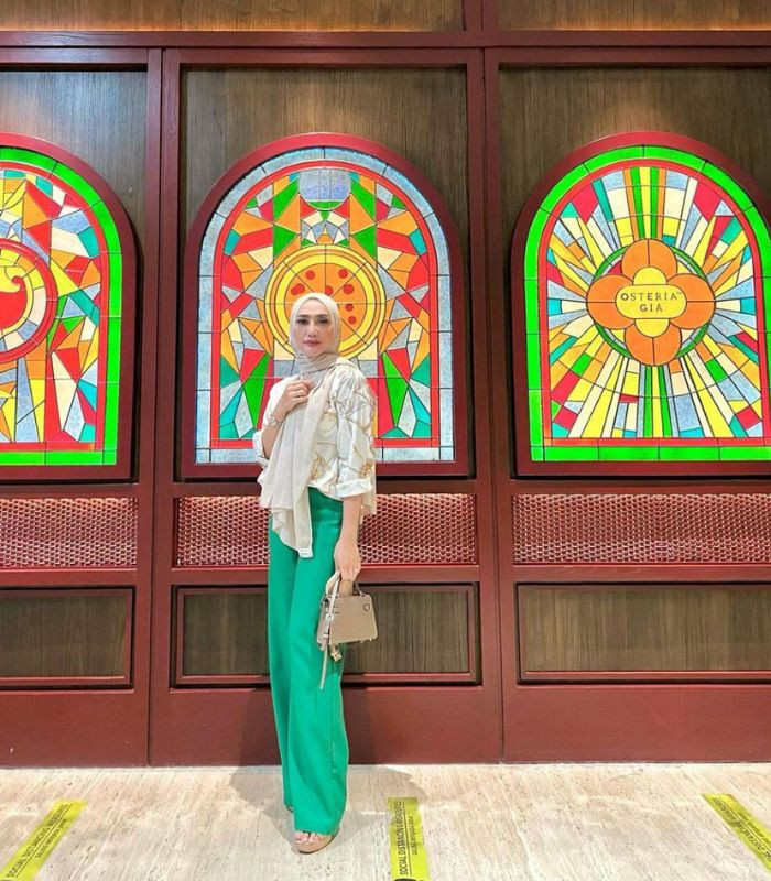 3. Berani tampil beda memberikan kesan eye-catchy. Kombinasikan kemeja satin putih motif corak dengan hijab pashmina warna cream serta high waist wide leg pants warna hijau yang cetar. Bikin look-mu makin all out gunakan hand bag dan wedges heels warna senada.