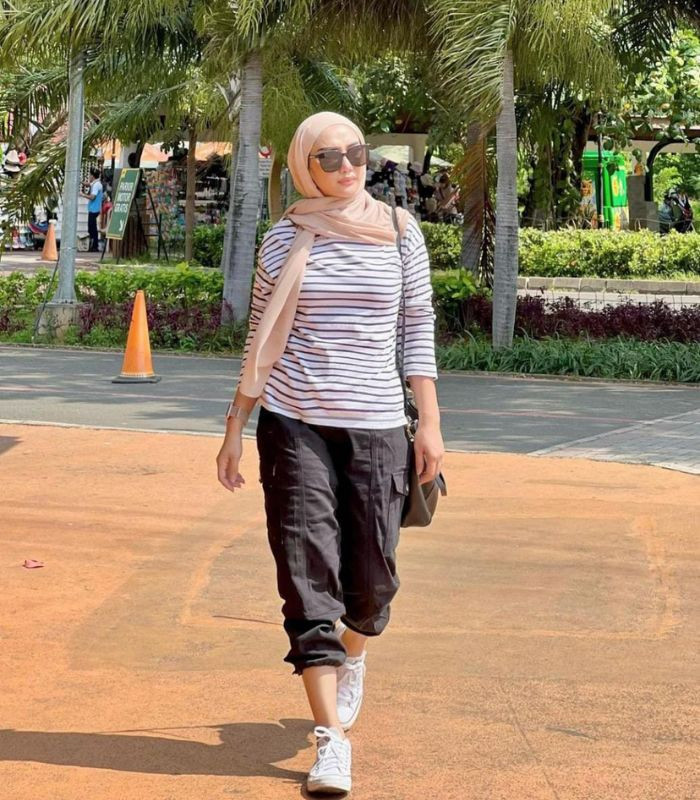 5. Outfit gaya santai saat hangout, Lita memakai long sleeve striped tee dipadukan cargo pants hitam serta hijab pashmina warna nude, lengkapi dengan sling bag dan sneakers andalanmu, ya!