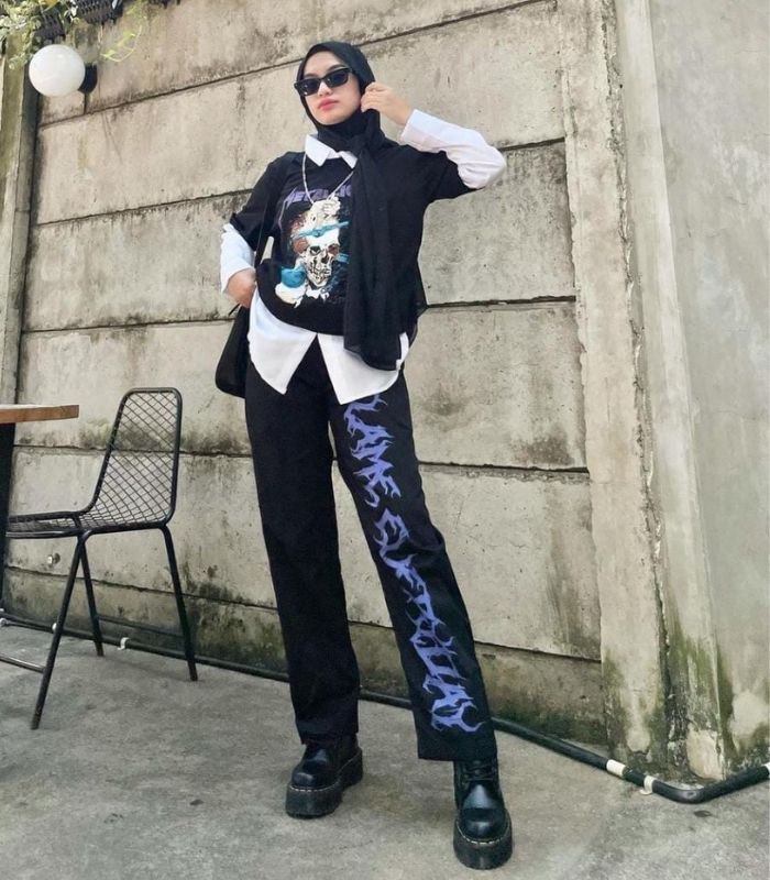1. Perpaduan kemeja putih yang dibalut sleeve t-shirt bergambar dengan pants hitam bermotif flame dan hijab pashmina yang senada dengan tambahan aksesori kalung serta kacamata. Bikin look-mu tampil dengan gaya yang edgy!