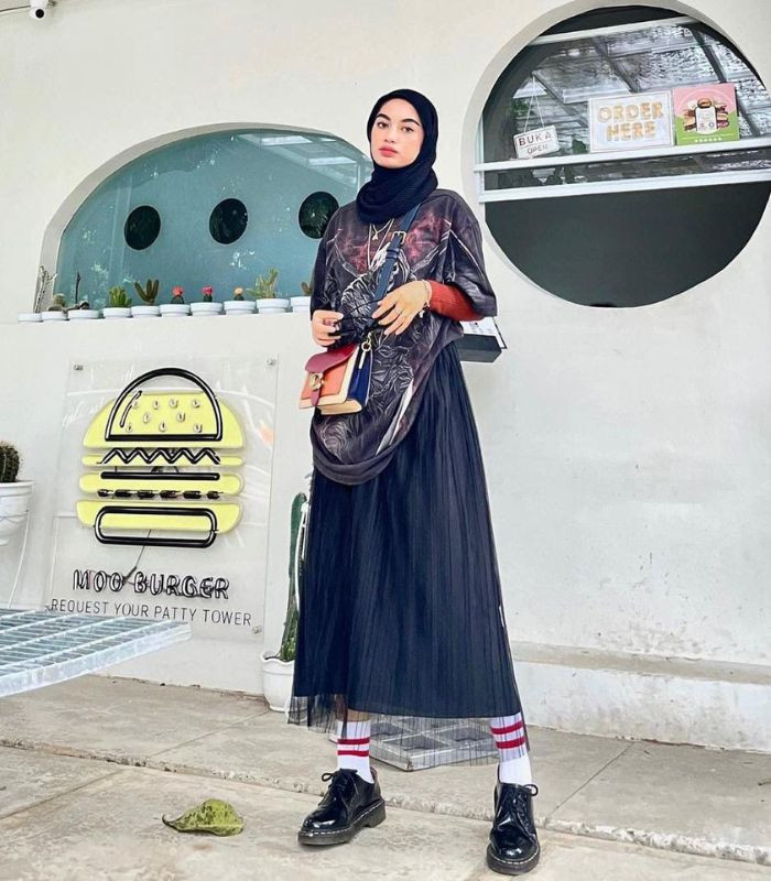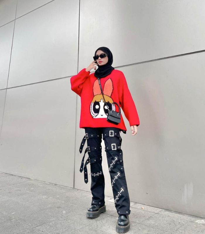 10. Terakhir, pilih oversized sweater warna merah bergambar dipadukan dengan hijab pashmina dan pants dengan aksen seperti ini serta tambahan sling bag, sunglasses, combat boots berwarna hitam senada. Jadilah penampilan yang terkesan metal look!