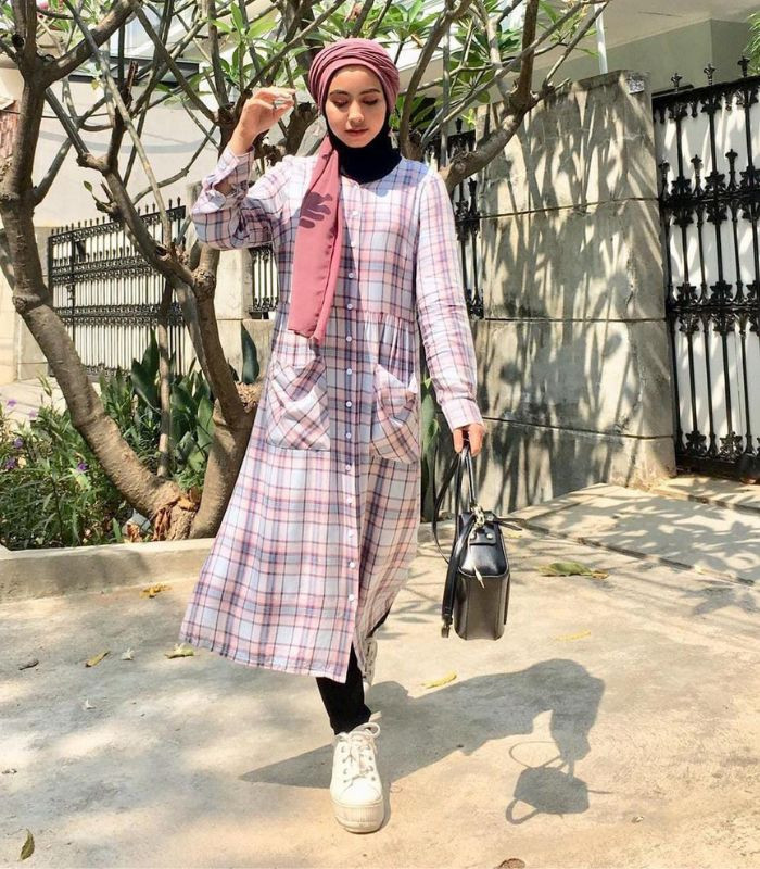 10. Terakhir, Lanie memadukan tunik motif kotak-kotak dipadankan dengan hijab pashmina berwarna mauve serta celana legging hitam. Bikin penampilanmu terkesan softgirl yang cute abis!
