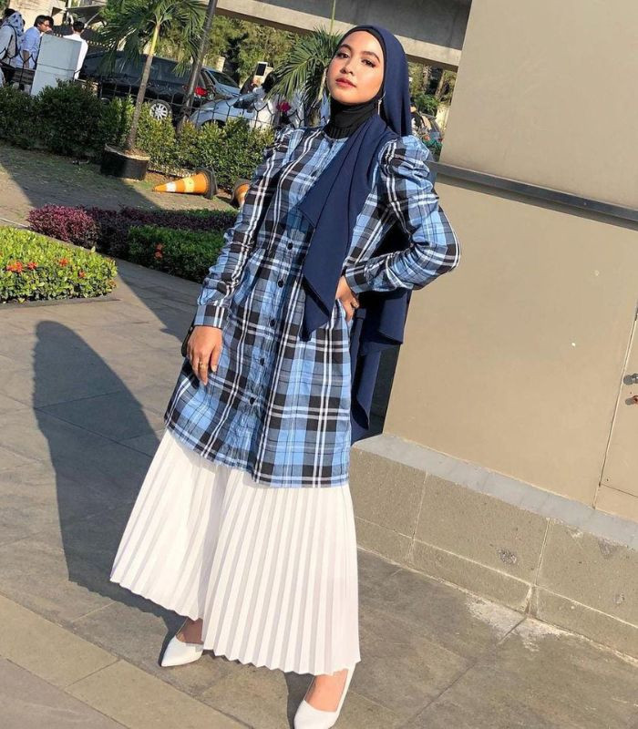 2. Perpaduan kemeja tunik warna biru muda motif kotak-kotak dengan rok plisket putih yang senada dengan high heels, tak lupa kenakan inner ciput ninja hitam dibalut dengan hijab pashmina warna navy. Bikin look-mu tampil stylish yang kekinian!