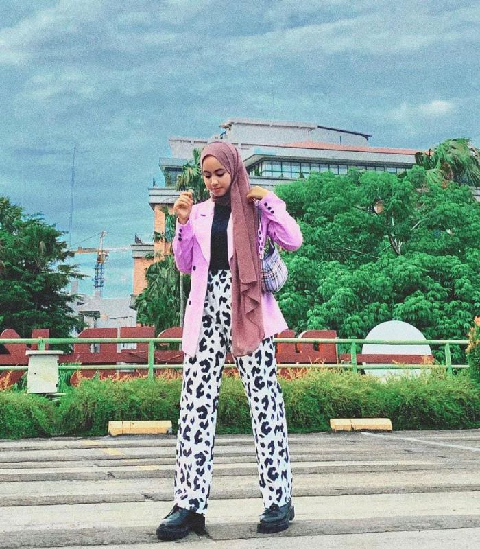 3. Tampil berani yang beda, Lanie memadukan manset hitam dibalut dengan blazer warna lilac dipadankan dengan straight pants motif seperti ini, pilih hijab pashmina berwarna mauve, tambahkan shoulder bag dan combat boots sebagai penunjang outfit yang kece!