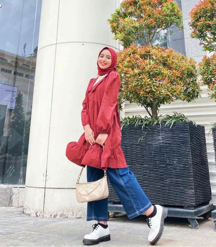 4. Mix tunik merah maroon beraksen wide collar yang senada dengan hijab segi empat dan match dengan celana kulot jeans. Lengkapi outfit-mu dengan shoulder bag dan combat boots putih, bikin penampilanmu jadi lebih modis abis!