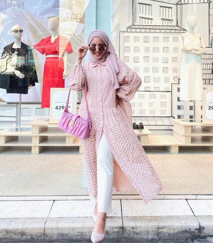 5. Penampilan yang memberikan kesan girly abis dengan memadukan tunik bermotif warna soft pink yang senada dengan hijab pashmina dipadankan dengan straight pants dan high heels berwarna putih senada. Lanie menambahkan aksesori sunglasses sebagai pemanis outfit-nya.
