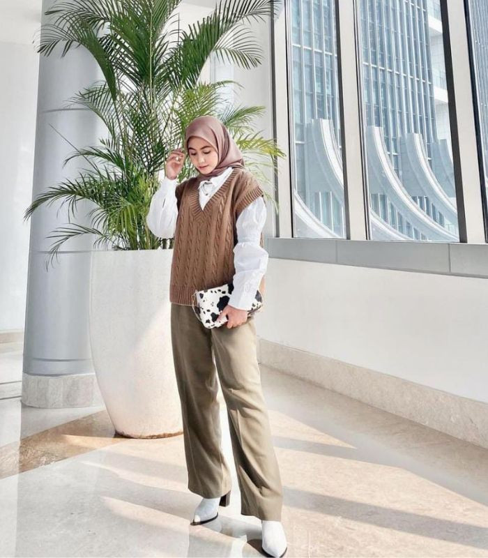 6. Gaya satu ini mengusung konsep earth tone terkesan modis yang cocok juga dikenakan untuk office look dan ngampus, nih! Gunakan oversized kemeja lengan panjang warna putih dibalut dengan knit vest berwarna coklat yang senada dengan hijab segi empat serta high waist loose pants berwarna khaky. Agar penampilanmu makin all out gunakan ankle boots putih dan hand bag senada.