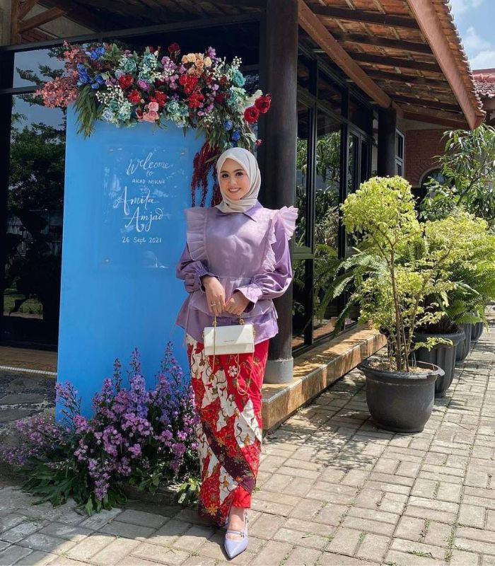 7. Outfit satu ini cocok dikenakan saat ke kondangan. Lanie menggabungkan blouse model fluffy warna lilac dengan rok lilit motif batik berwarna merah serta tak lupa pilih hijab segi empat warna netral seperti broken white ini. Terkesan colorful namun tetap terlihat stylish yang eye catchy.