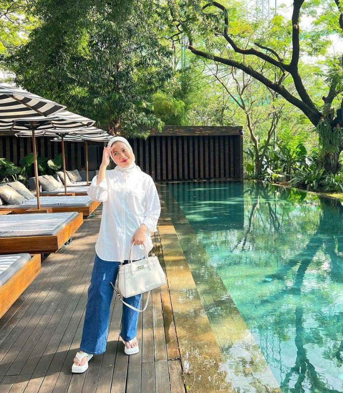 1. Ratu menggabungkan kemeja putih lengan panjang yang senada dengan hijab segi empat, hand bag dan sandals dipadukan dengan celana kulot jeans, bikin look-nya terlihat elegan yang terkesan preppy chic!
