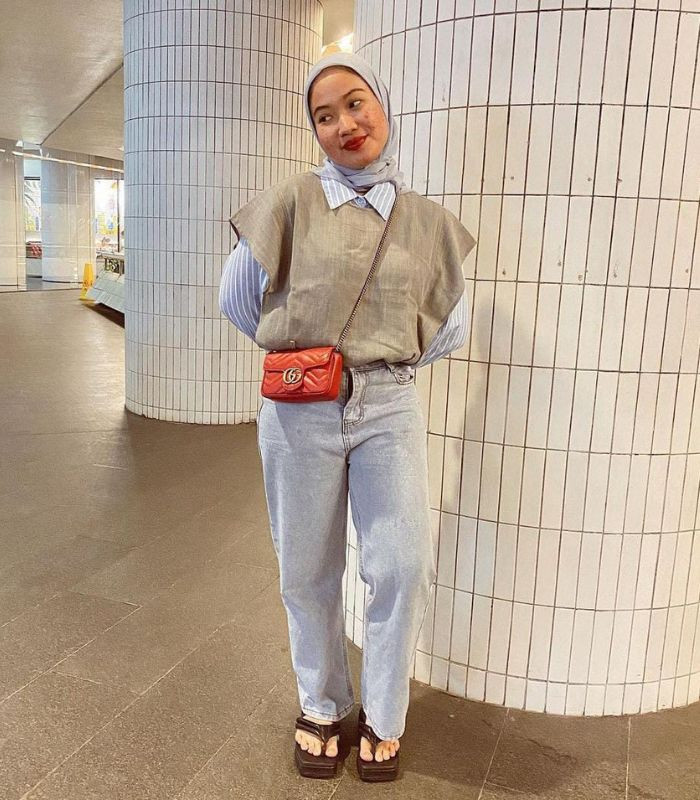 6. Outfit yang memberikan kesan casual look yang nyaman untuk hangout seharian. Ratu memadukan kemeja striped warna biru dibalut dengan linen vest berwarna abu-abu padankan dengan high waist loose jeans serta hijab segi empat warna light grey.
