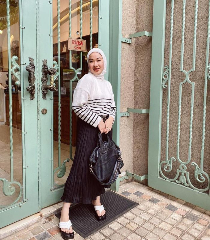 7. Perpaduan long sleeve striped t-shirt warna putih yang senada dengan hijab segi empat dipadankan dengan rok plisket hitam, outfit yang cocok juga dikenakan untuk office look dan ngampus, nih! Terkesan simple namun tetap terlihat effortless!