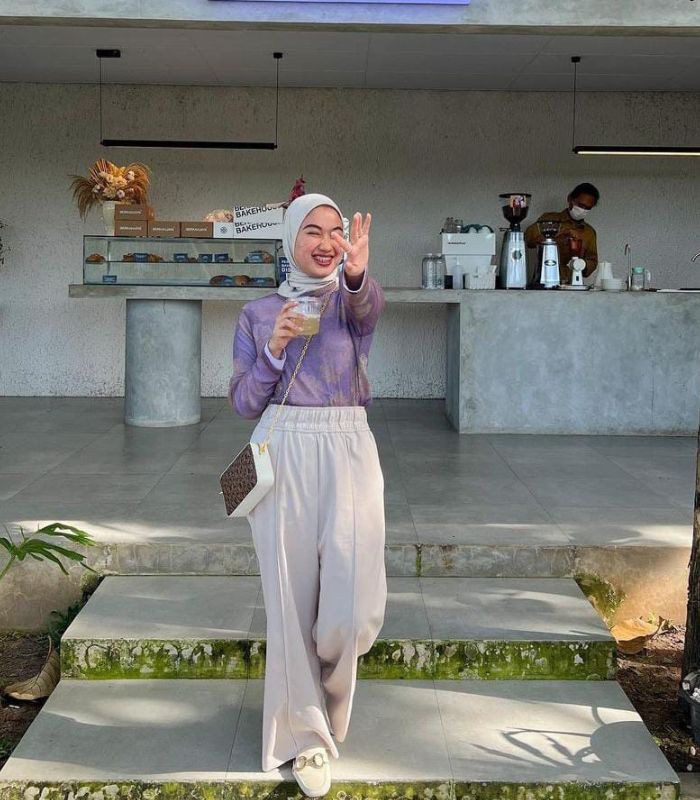 8. Ratu memilih long sleeve t-shirt berwarna lilac dipadukan dengan high waist loose pants warna ivory yang senada dengan hijab segi empat, tambahkan sling bag dan mules shoes senada agar look-mu makin modis!