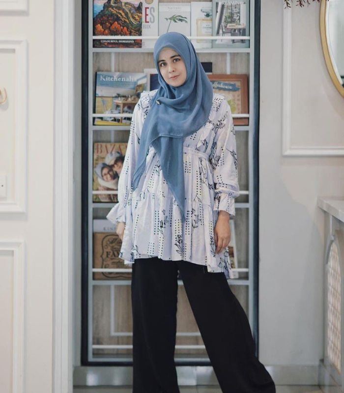 2. Hijab minimalis yang memberikan kesan modis! Risty memadukan sleeve shirt warna biru dengan hijab pashmina berwarna soft pink serta celana kulot bermotif, tambahkan hand bag dan flat sandals andalanmu, ya!