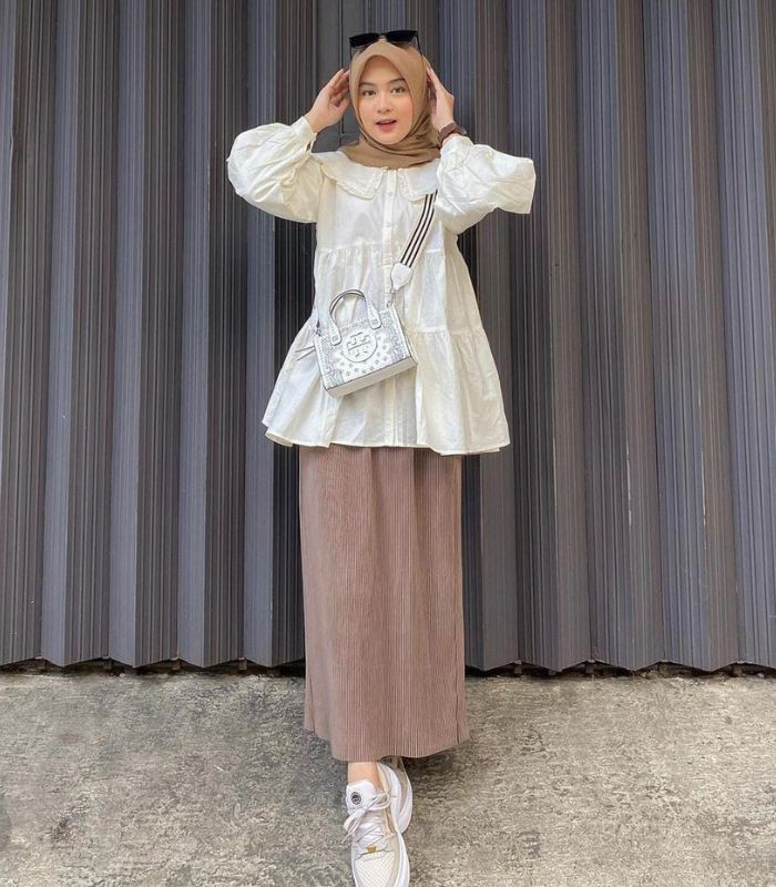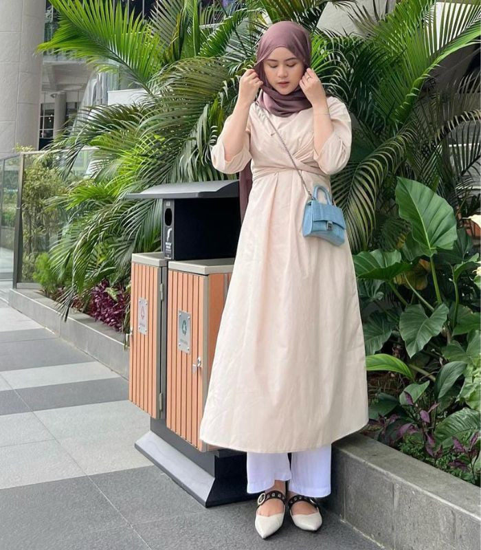 5. Penampilan yang memberikan kesan feminin look yang anggun. Kombinasikan midi dress berwarna cream dengan high waist loose pants warna putih padankan dengan hijab pashmina warna dark choco.