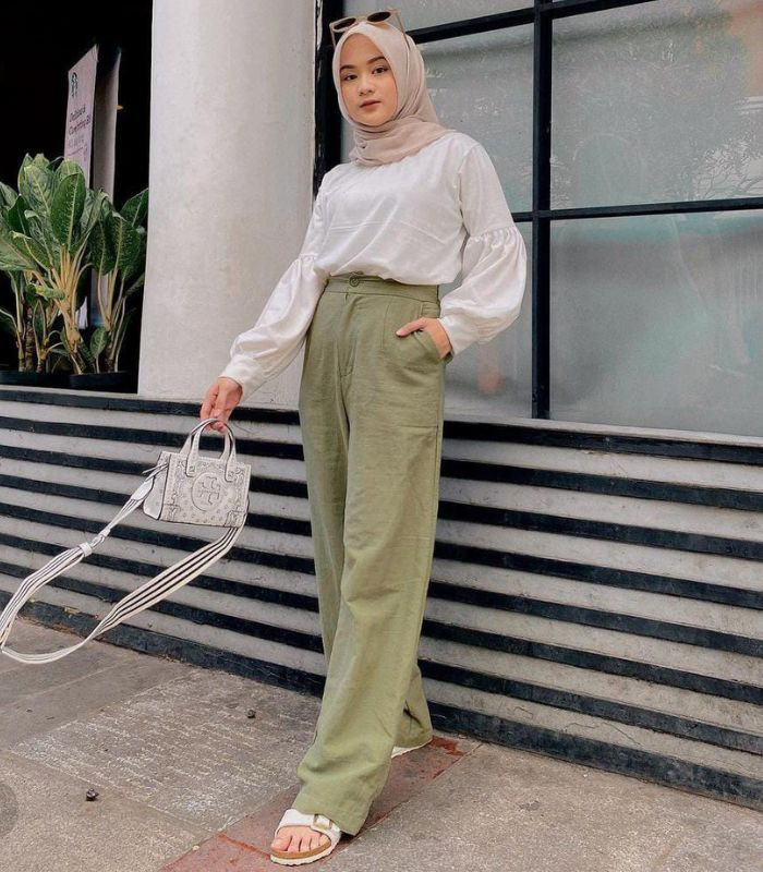 3. Outfit yang terkesan fresh look yang modis kekinian banget, nih! Alifhia menggabungkan sleeve blouse warna putih dengan high waist loose pants berwarna sage green dipadukan dengan hijab segi empat berwarna soft beige.
