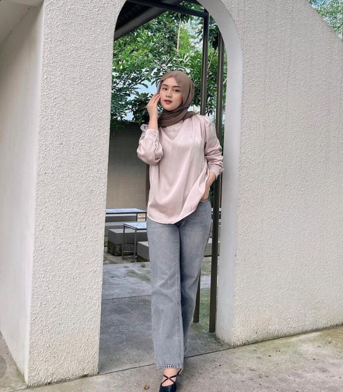 4. Terkesan casual style yang nyaman dikenakan seharian. Perpaduan silk blouse berwarna dusty pink dengan high waist loose jeans serta pilih hijab pashmina berwarna dark choco. Bikin penampilanmu makin all out gunakan flat shoes andalanmu, ya!