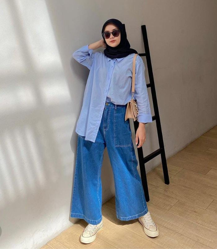 6. Terkesan simple namun tetap terlihat effortless yang nyaman cocok buat Anda yang anti ribet! Gunakan oversized shirt berwarna baby blue padukan dengan celana kulot jeans serta hijab segi empat warna hitam, berikan statement point pada outfit gunakan warrior shoes favoritmu!
