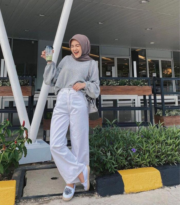 7. Padukan sleeve blouse warna misty grey dengan high waist loose jeans putih padankan dengan hijab segi empat warna charcoal, tambahkan slip on shoes putih agar look-mu makin all out yang terlihat modis.