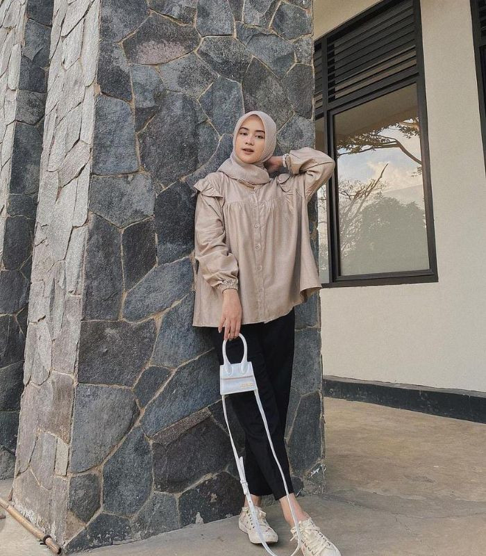 8. Outfit yang cocok juga buat hangout, nih! Perpaduan oversized blouse warna coksu yang senada dengan hijab segi empat padankan dengan straight pants hitam, lengkapi outfit dengan sneakers putih supaya makin stand out outfit-mu.