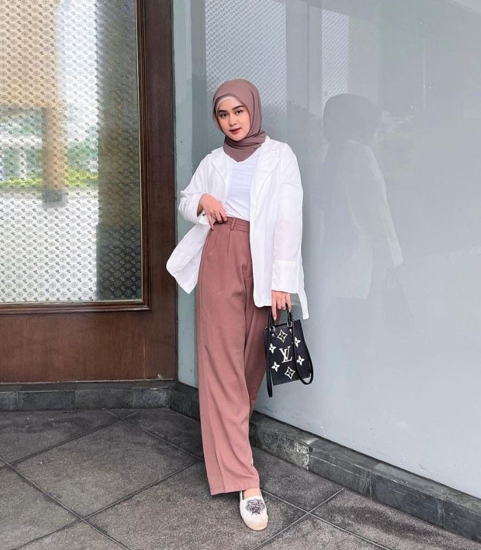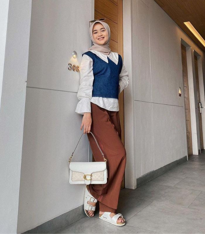 11. Terkesan elegan look yang cocok juga dikenakan buat hangout. Alifhia menggabungkan kemeja lengan panjang putih beraksen wide collar dibalut vest jeans padankan dengan celana kulot warna dark choco serta tak lupa pilih hijab segi empat warna soft beige.