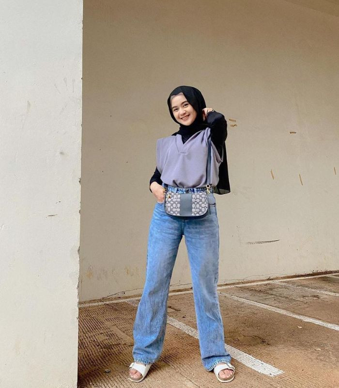 10. Penampilan yang memberikan kesan modis yang kekinian ini juga bisa banget Anda coba! Padukan manset hitam senada dengan hijab pashmina dibalut vest berwarna abu-abu padankan dengan high waist loose jeans.