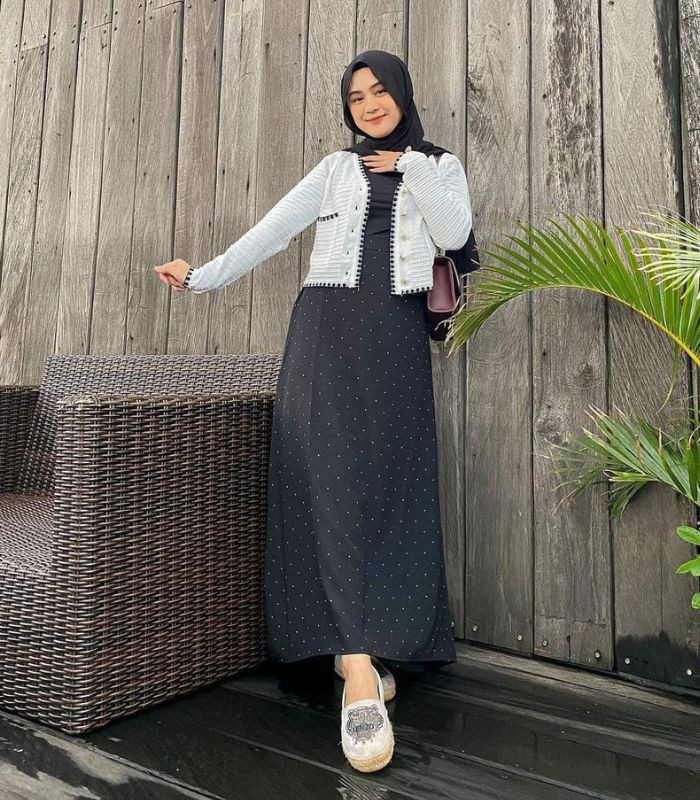 12. Terakhir, mengusung konsep monokrom style yang terkesan preppy chic, Alifhia memadukan manset, maxi skirt motif polkadot dan hijab pashmina berwarna serba hitam senada dibalut dengan cropped cardigan top berwarna putih yang serasi dengan slip on shoes.