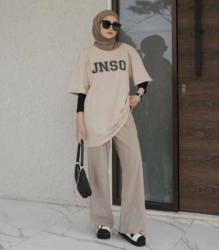 11. Terkesan simple namun tetap terlihat effortless yang nyaman untuk aktivitas seharian! Perpaduan manset hitam dibalut oversized t-shirt berwarna cream dengan high waist loose pants berwarna khaky serta pilih hijab berwarna coffee.