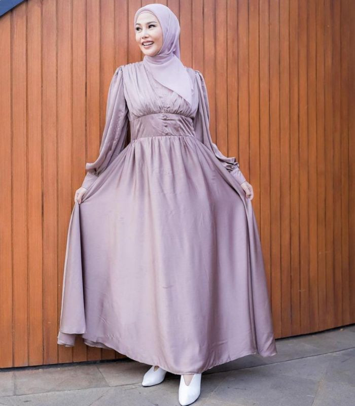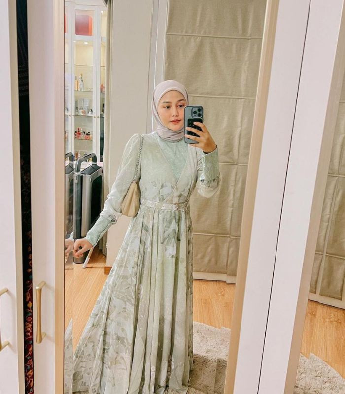 7. Perpaduan dress berwarna matcha dengan motif floral ini dipadankan dengan hijab pashmina berwarna light grey memang sangat cocok jika dikombinasikan. Tampilan outfit yang dikenakan Dara ini terlihat begitu cantik dan terkesan anggun yang menawan!