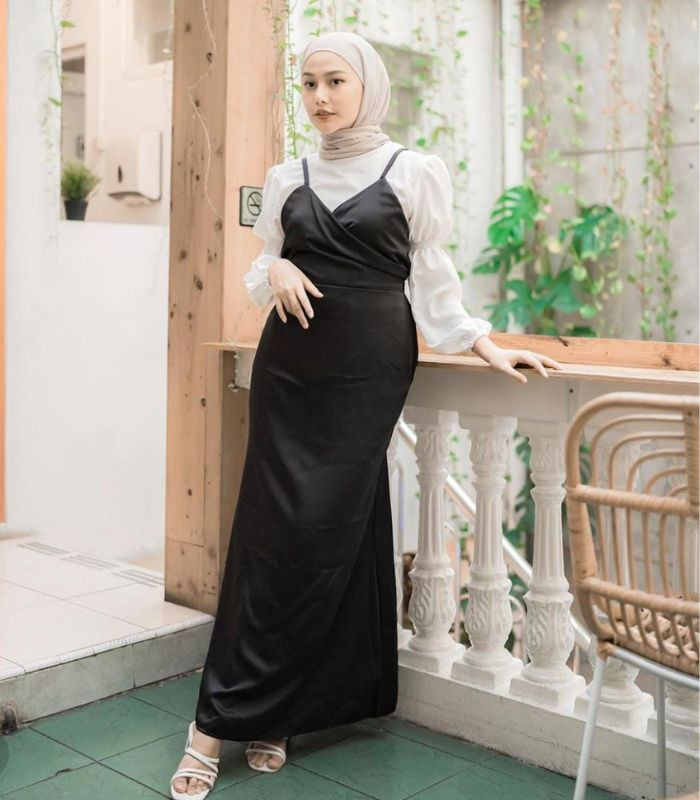 6. Cocok dikenakan untuk acara semi formal yang memberikan kesan elegan look! Dara memadukan fluffy blouse warna putih dibalut dengan overall silk top dress berwarna hitam dipadankan dengan hijab pashmina berwarna soft beige yang terlihat manis.