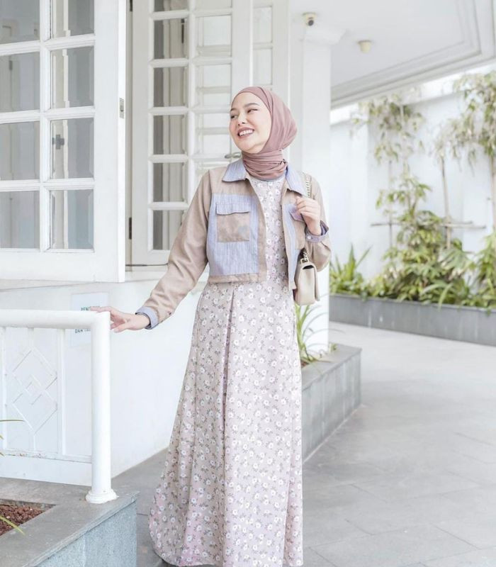 8. Tampil ala eonnie Korea yang terkesan modis yang trendy! Dara memadukan floral dress berwarna soft pink dibalut cropped top jacket perpaduan warna baby blue dan soft choco beraksen kantong, tak lupa ia memilih hijab pashmina warna soft seperti rosewood ini.
