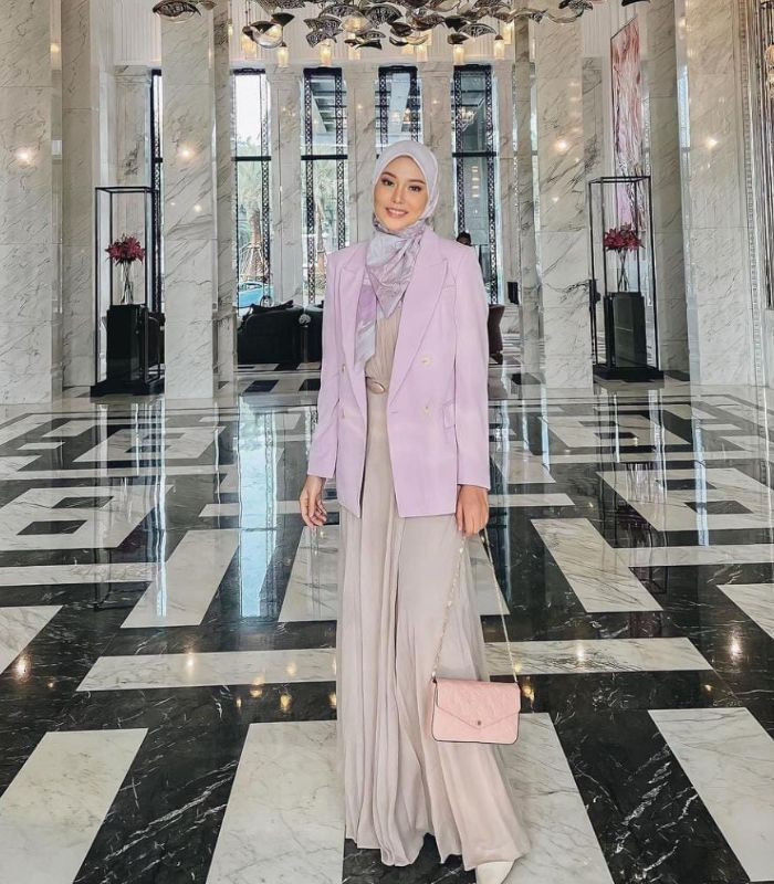 9. Tampil elegan look yang cocok juga dikenakan untuk office look. Dara menggabungkan basic long dress berwarna ash grey dibalut dengan blazer berwarna lilac serta hijab segi empat warna baby blue yang bermotif. Tambahkan hand bag dan flat shoes biar makin all out OOTD-mu.