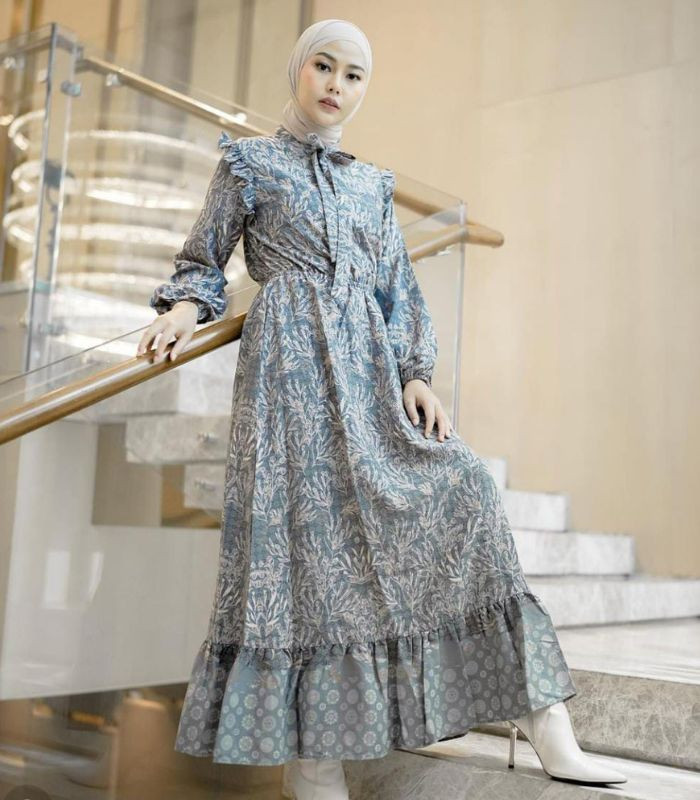10. Terakhir, Dara memilih dress warna biru bermotif dipadukan dengan hijab pashmina berwarna soft beige, tambahkan ankle boots sebagai statement point pada outfit yang memberikan kesan feminin yang anggun!