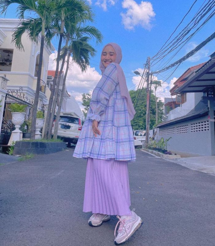 2. Fatin menggabungkan blouse putih bermotif kotak-kotak dengan rok plisket berwarna lilac serta hijab pashmina berwarna soft purple, bikin penampilannya terkesan ala eonnie Korea yang cute!