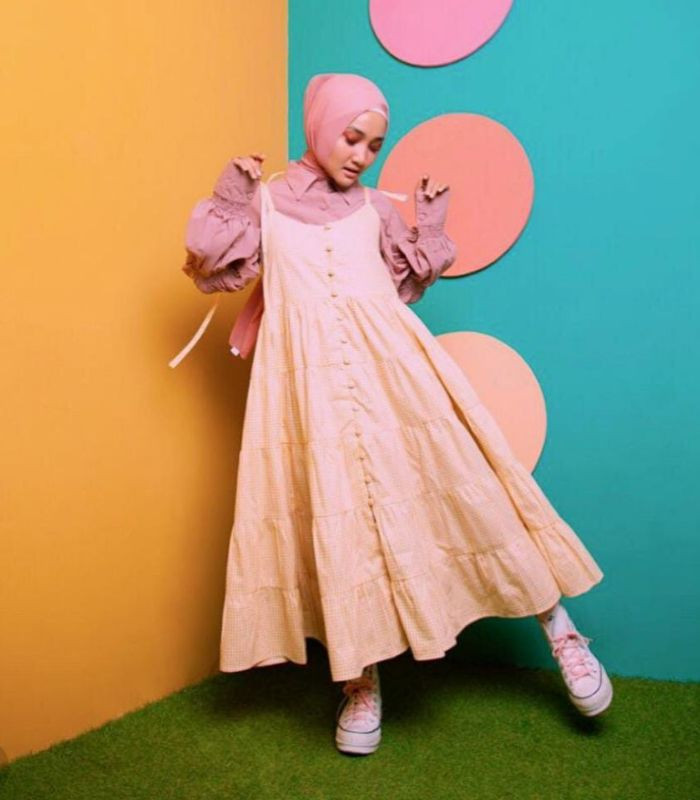 3. Penampilan yang memberikan kesan stylish yang terlihat menawan ini. Ia memadukan oversized shirt berwarna pink yang senada dengan hijab pashmina kemudian dibalut overall top dress berwarna cream, tambahkan warrior shoes agar outfit-mu makin all out!