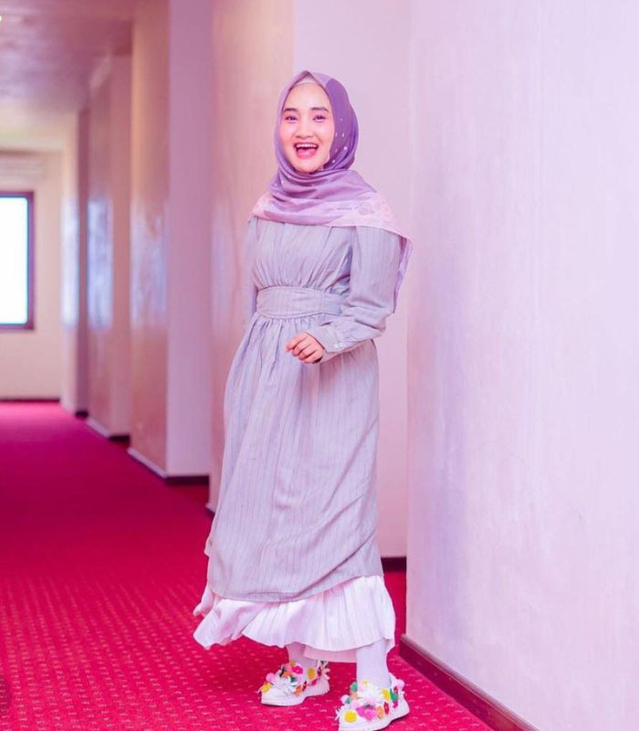 4. Memadukan tunik berwarna baby blue dengan rok plisket putih dipankan dengan hijab segi empat warna ungu bermotif, kenakan sepatu cute seperti ini jadi pilihan fatin untuk outfit supaya makin stunning!