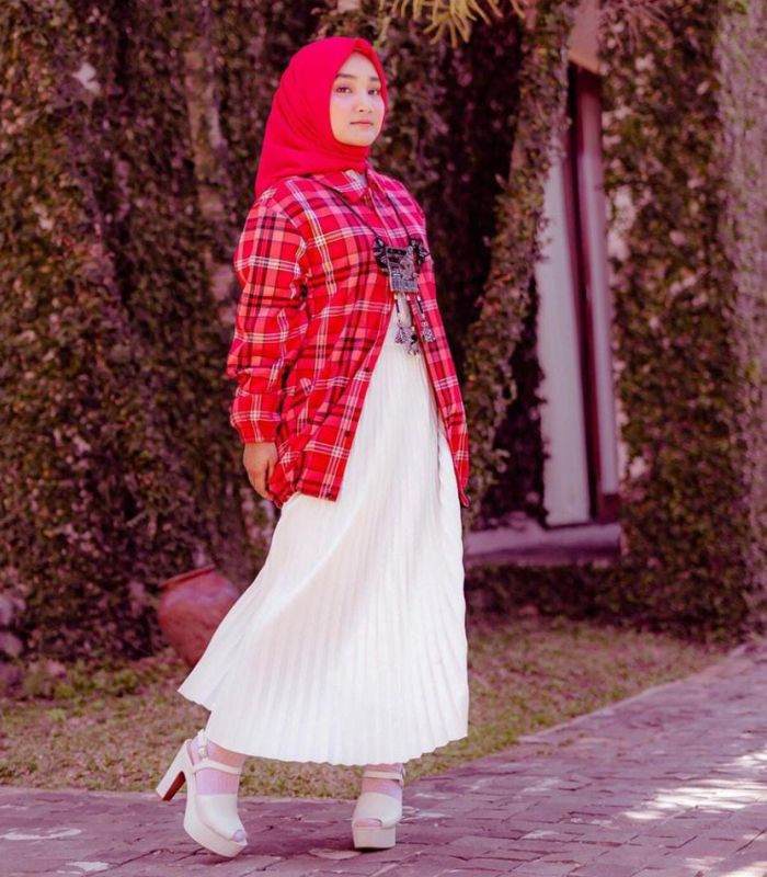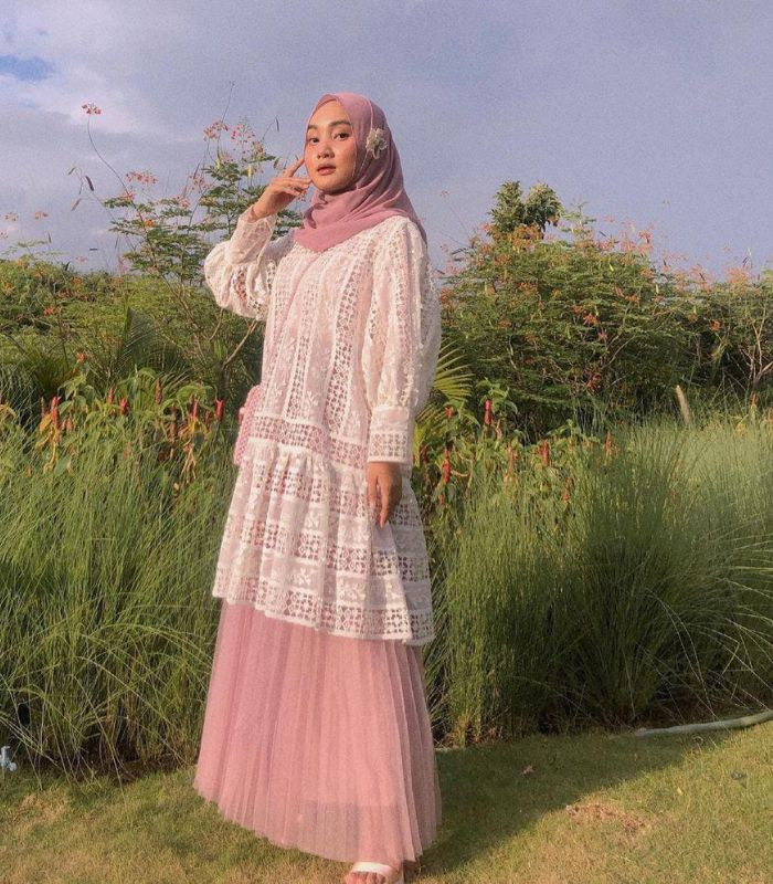 8. Tampil feminin look yang memberikan kesan stunning! Fatin memadukan tunik motif brukat warna putih dengan rok tutu berwarna pink yang senada dengan hijab pashmina. Bikin penampilannya makin terlihat cantik, ya!