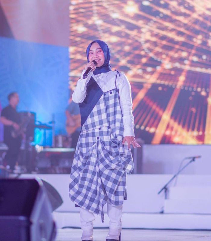6. Saat perform pun fatin selalu tampil stylish yang memukau! Ia menggabungkan kemeja lengan panjang putih dibalut overall top dress warna biru bermotif kotak-kotak dipadankan dengan straight pants berwarna putih, tak lupa ia memilih hijab pashmina berwarna dark navy.