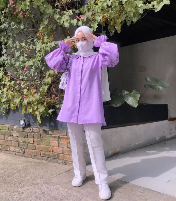 7. Terkesan simple namun tetap terlihat effortless yang cocok dikenakan untuk hangout! Fatin memgombinasikan kemeja lengan panjang berwarna lilac dengan straight pants berwarna putih yang senada dengan hijab pashmina dan sneakers, tambahkan shoulder bag berwarna lilac yang senada dengan outfit.