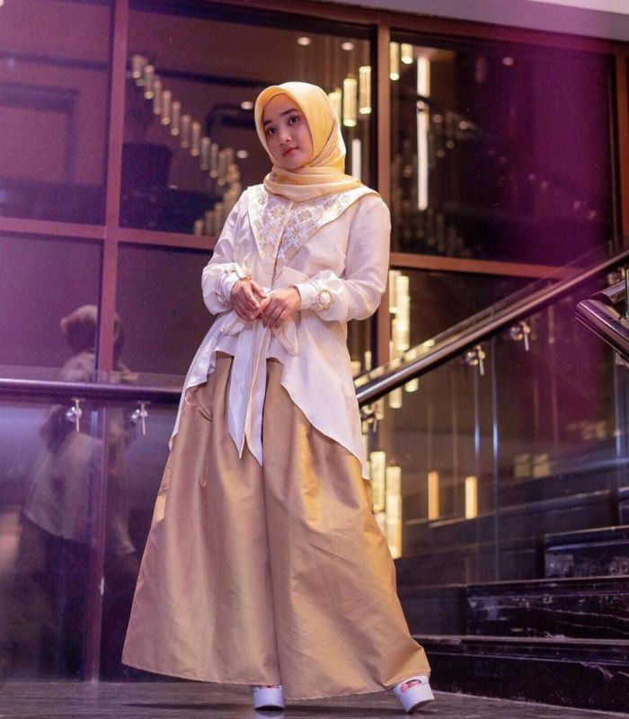 9. Perpaduan blouse bermotif warna cream yang berpotongan asimetris dipadankan dengan celana kulot berwarna gold serta hijab segi empat warna soft yellow, penampilan fatin yang memberikan kesan modis yang kekinian!